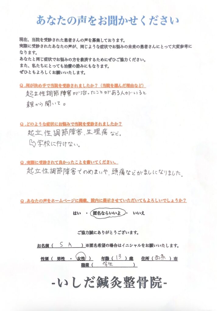 【中学生女子の起立性調節障害・めまい・頭痛】「先生に診てもらってから、めまいや頭痛がしない日が増えてきました」【中学生のお困り】