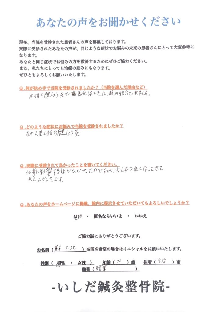 「受診するたびに良くなり、痛みを気にせず仕事ができるようになりました」 腱鞘炎にお悩みだった21歳男性からいただいた喜びのお声 Q.何が決め手で当院を受診されましたか?(当院を選んだ理由など) 左指の腱しょう炎悪化したと...