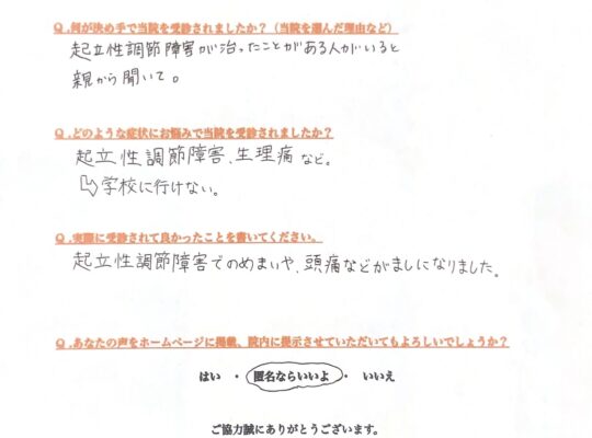 中学生のお悩み 患者さんの声 起立性調節障害【中学生女子の起立性調節障害・めまい・頭痛】「先生に診てもらってから、めまいや頭痛がしない日が増えてきました」【中学生のお困り】 「先生に診てもらってから、めまいや頭痛がしない日が増えてきました」 起立性調節障害にお悩みだった中学生からいた …