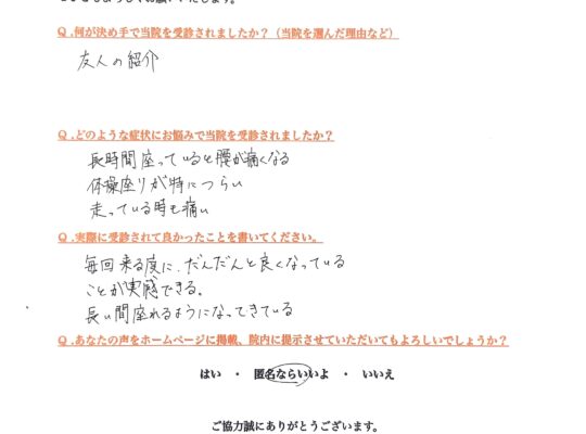 「座っていても痛みが気にならなくなりました。施術に来るたびにだんだんと良くなっていることが実感できます」 長時 …