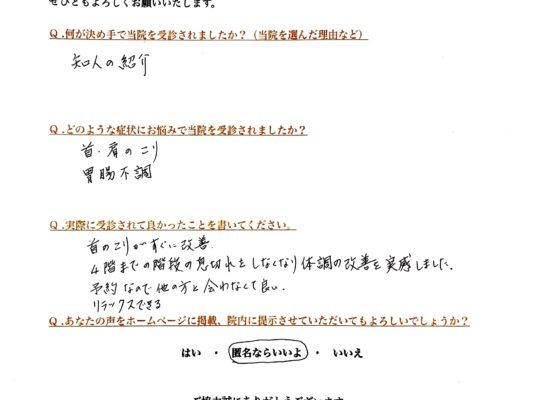 【首・肩のこり、胃腸の不調】「治療後すぐに効果を実感しました。肩や首のこりが良くなって、階段の息切れもしなくなり体調が良くなっています。 完全予約制なので、誰にも合わない予約システムが嬉しいです。 リラックスして施術を受けることができます」【60代女性 会社員の方のお悩み】