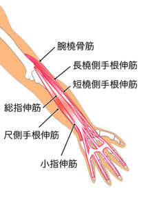 手首を反らす(背屈)ときには、肘の外側から伸びる「伸筋」という筋肉群が働きます。