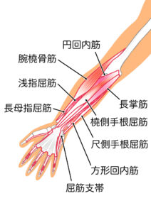 屈筋は肘の内側からはじまり、手首や指を曲げる働きをしています。