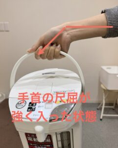 指先主導で持ち上げると手首が尺屈しやすく、さらには肘まわりの伸筋群に負荷が集中します。