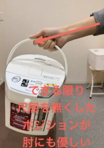肘への負担を減らすためには、取手を持つときの手首のポジションが重要