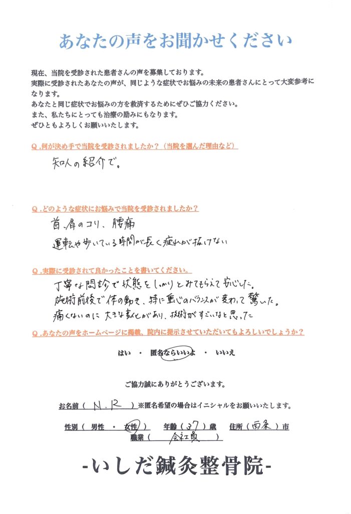 【長時間運転で起こる腰痛、肩・首のこり】「痛みのない治療法なのに、施術後の体の変化に驚きました。丁寧な問診と診察で安心して通えています」【30代女性 営業職員さんのお困り】
