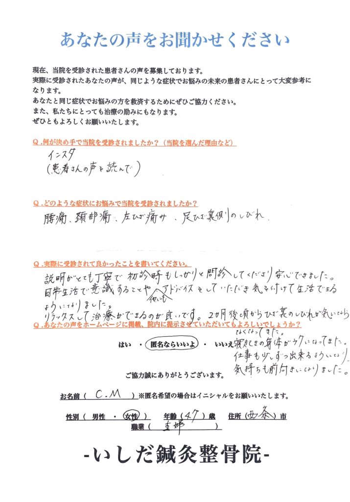 「2ヶ月ほどで痛みが気にならなくなり、寝起きの身体が楽になっているのを 感じています。仕事も徐々にできるようになり、気持ちも前向きになりました」 日常生活に影響するほどの腰痛・膝裏の痛みにお悩みだった 47歳女性からいただいた喜びのお声 &nb...
