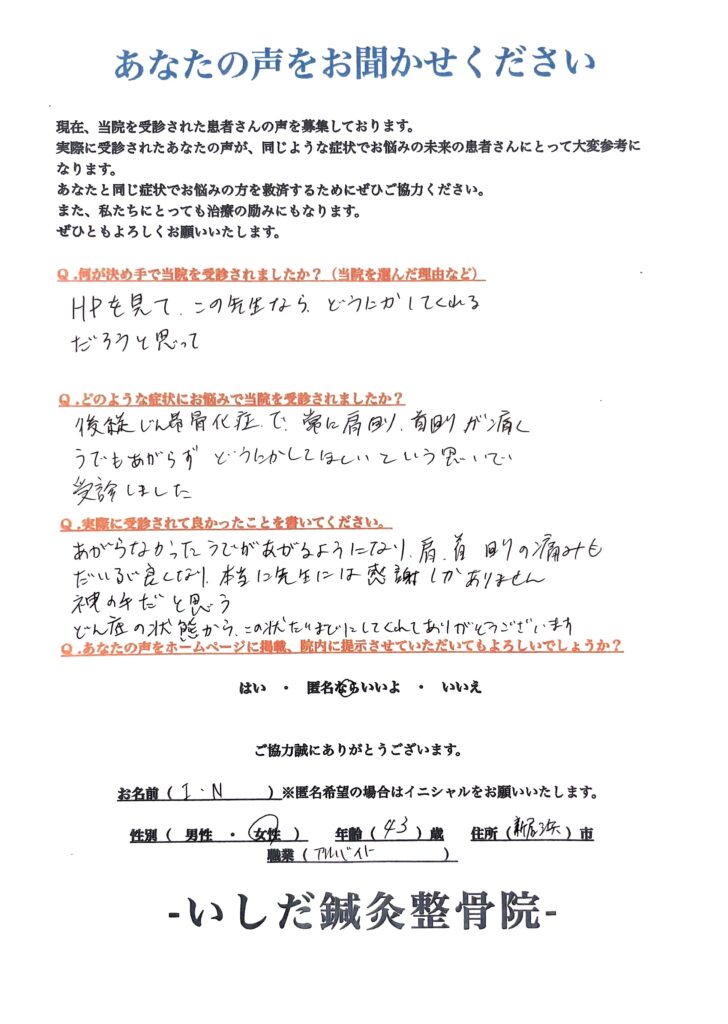 【後縦靱帯骨化症・激しい首の痛み・腕が上らない】「痛みが軽くなり、腕も上がるようになりました。どん底の状態からここまで良くしてくださり、先生には感謝しかありません」【40代女性からのお悩み】