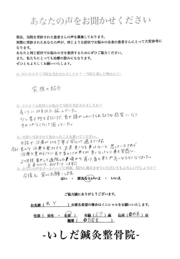 【20年以上続く肩こり】「2ヶ月ほどで肩や首の辛さが気にならなくなり驚いています。もう良くなることはないと諦めていたけど、いしだ先生にお願いして良かったです」【67代女性 自営業の方のお困り】