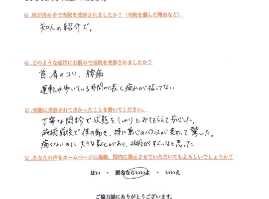 【長時間運転で起こる腰痛、肩・首のこり】「痛みのない治療法なのに、施術後の体の変化に驚きました。丁寧な問診と診察で安心して通えています」【30代女性 営業職員さんのお困り】