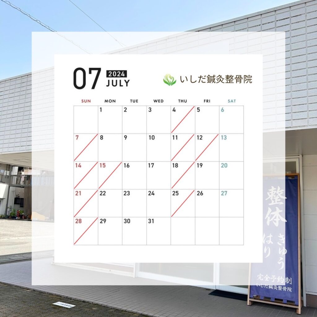 こんにちは。いしだ鍼灸整骨院院長の石田将太郎です。 今年も折り返し地点に来ました。 早いですね〜。 当院の2024年7月の診療スケジュールと、梅雨や初夏の養生方法についてお知らせします。 ◯令和6年7月の診療スケジュールについて ...