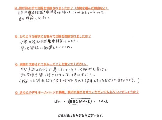 「痛みを根本から治療してくださり、体全体のバランスも整いました。以前よりスムーズに動けるようになりました」