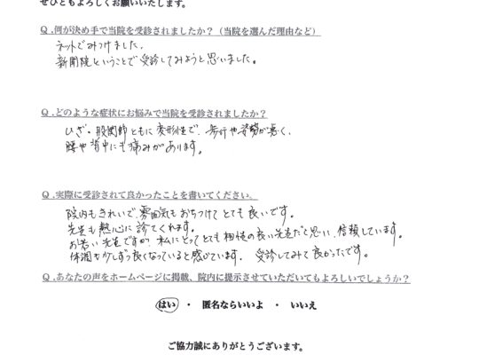 「施術を重ねるごとに痛みが楽になり、体の使い方も変わってきました」
