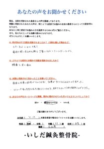 「原因と治療についての説明がわかりやすく、体の変化もすぐに実感できたので驚きました。日常でできる予防法なども教えて下さり、自分でも前向きに取り組むことができています」