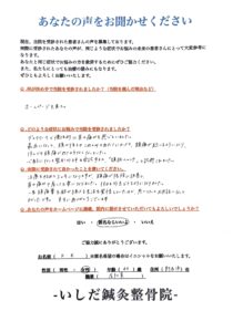 【デスクワークによる慢性的な肩こり・首の痛み】「頚椎ヘルニアでリハビリに通っていましたが、良くならずに悩んでいました。いしだ鍼灸整骨院さんに通うになって2ヶ月足らずで頭痛が格段に改善し、首の痛みや肩こりも楽になりました。 一生頭痛薬を飲み続けると覚悟していたので、思い切ってお世話になって良かったです」【40代女性 会社員の方のお悩み】
